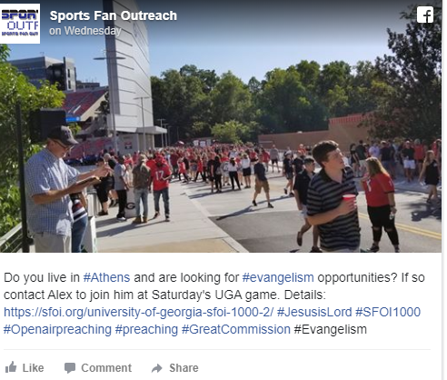 | DO YOU LIVE IN ATHENS? -Nov 15, 2019 The SFOI 1,000 is a movement to have the Gospel preached Lord willing at every major sports venue in the world (this includes venues with a capacity of 40,000+ and NBA, Cricket and other venues for professional sports.) Details of the SFOI 1000 and a list of stadiums are here: https://sfoi.org/sfoi-1000/ |